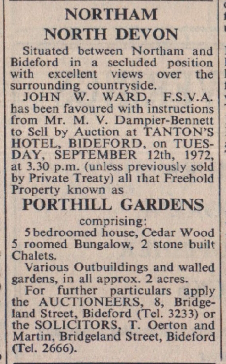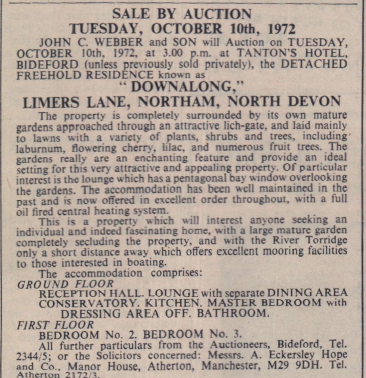 Diddywell Manor and annexe, Northam, was sold by auction by Messrs Kivell and Sons, of Bideford, for £20,000. Purchaser was a Mr Holtzer.
