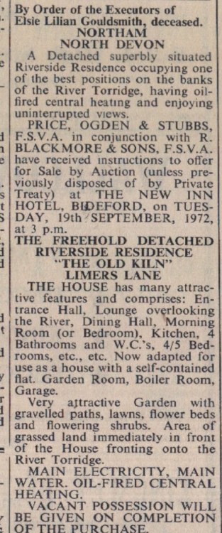 By Order of the Executors of Elsie Lilian Gouldsmith, The Old Kiln, Limers Lane, Northam, is for sale.