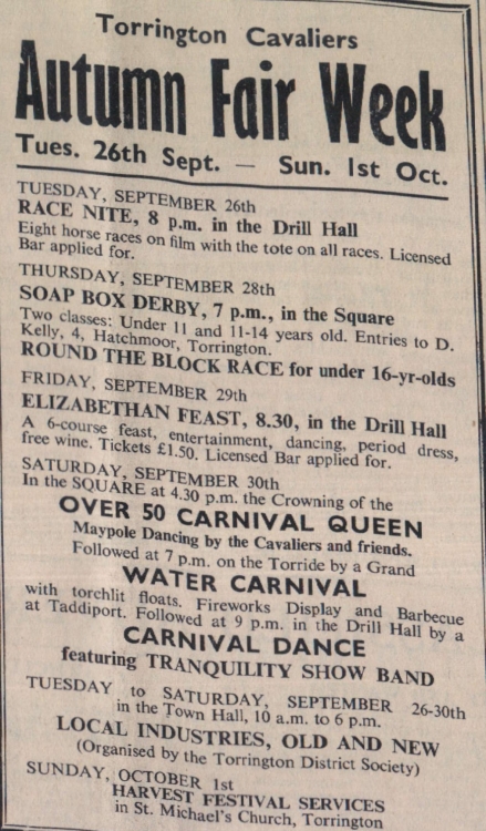 Torrington’s new Town Crier, Mr Norman Dymond, has attended his first National Town Criers’ contest, held at Hastings. Having taken over from the champion of so many years, Mr Bert Waldron, Mr Dymond must have felt great pressure on him to do well. Mr Bill Matthews, of Holsworthy, a seasoned participant and a former champion, who was this year placed fourth, said “Norman put up a tremendous show considering he had no experience whatever of a major event like Hastings. You can take it from me – and I ought to know by now – Torrington has another champion in the making.”