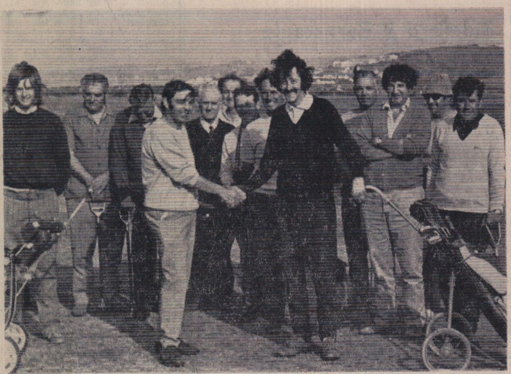 Bideford postman John Slocombe, winner of this year's Schoolmasters Cup competition at the Royal North Devon Golf Club's Autumn meeting, is congratulated by losing finalist Charles West, who is captain of the Torrington club.