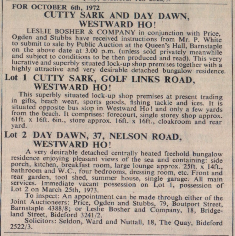 Cutty Sark in Golf Links Road and Day Dawn, 37 Nelson Road, both Westward Ho! are to be sold by Public Auction.