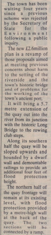 Torridge planners have given a unanimous ‘go ahead’ to the controversial £2.6 million flood defence scheme for Bideford Quay. Councillors were of the opinion that while not perfect the scheme before them must go ahead. To delay might only bring more flooding and anguish. It was, said Cllr Hugo Barton, “the best scheme we are likely to get.”.