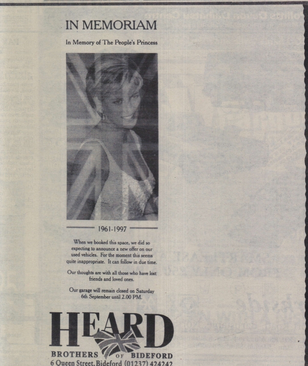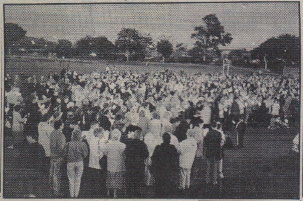 Bideford paid its own tribute to Diana, Princess of Wales, with a poignant non-denominational open air service. As the body of the princess was carried from its resting place in St James Palace to her home at Kensington Palace up to 2,000 people gathered in Victoria Park. From tiny tots to great-grandparents they stood with lighted candles in answer to a call Linda Taylor had taken up by the town’s churches. “Linda phoned me in tears and said we really must do something in the town to get people together and express their grief” said Bideford Vicar the Rev Tim Jessiman. Colleagues at the Midland Bank and pupils of Grenville College gave out service sheets, candles and made a collection. A hush fell on Torridgeside on Saturday as towns and villages throughout the area mourned the loss of the princess.