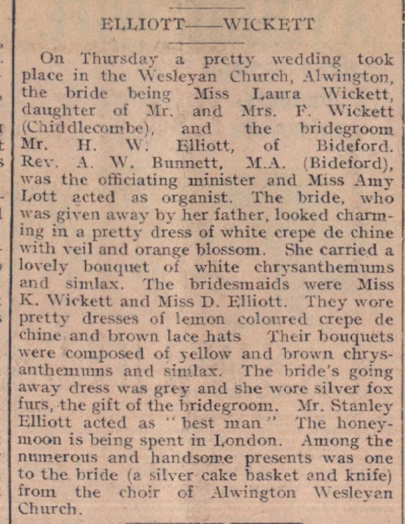 A pretty wedding took place at Alwington, the bride being Miss Laura Wickett and the bridegroom Mr H W Elliott.