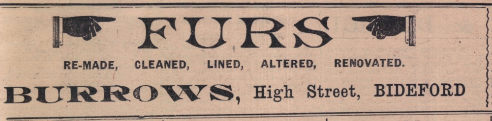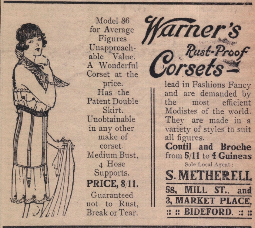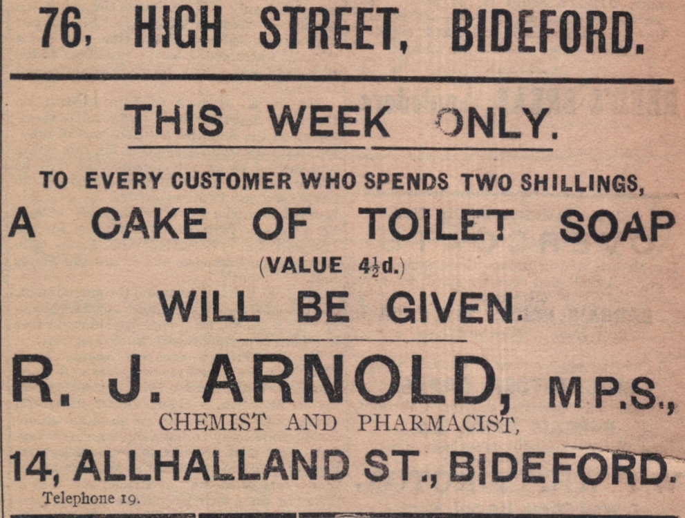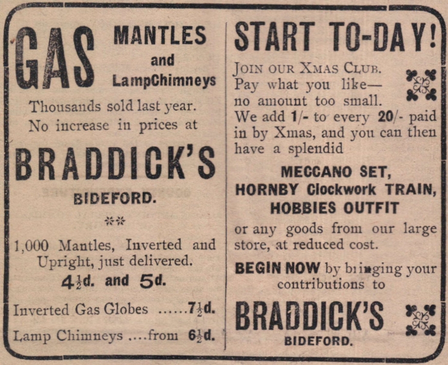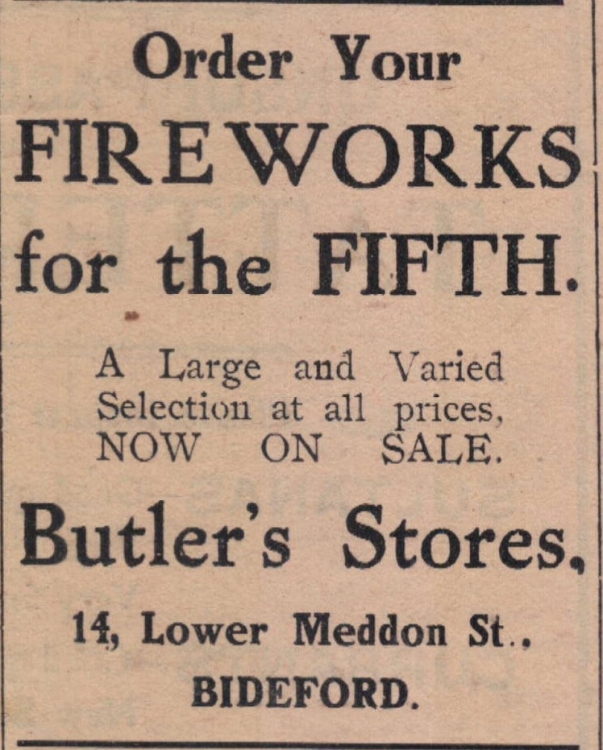 Among Bideford traders, Heywood and Cock advertise new autumn millinery, winter coats, raincoats and jumpers; Steward & Co of 52 Mill Street, have vests, combinations and flannelette nightwear to keep you warm; and Arthur W Bennett of Market Place suggests preparing for a cold or wet winter with Valor Perfection Oil heaters, which come in two sizes and are suitable for everything from the nursery to the factory. Looking ahead to bonfire night, we have an advert from Butler’s Stores.