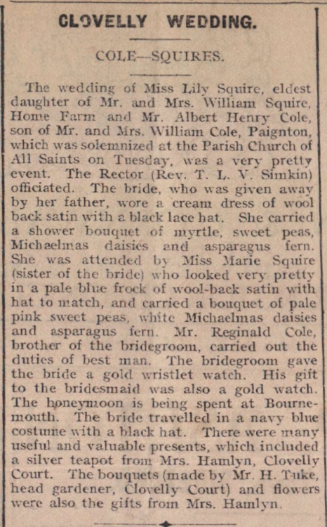 A pretty wedding was solemnised at All Saints’ Church, the contracting parties being Miss Ruth Jewell, daughter of Mrs S Jewell, High Street, Clovelly, and Mr John Burnett, eldest son of Mr and Mrs J Burnett, Brookfield Terrace, Bideford. The Rector, Rev T L V Simkin, officiated. The bride, who was given away by her brother, Mr F Jewell, wore a navy costume and a made hat of fawn ribbon. She carried a beautiful bouquet of sweet peas, white antirrhinum, roses and myrtle, made by Mr William Beer, gardener at Clovelly Court, the gift of Mrs Hamlyn. Miss Hester Jewell, bride’s sister, was the bridesmaid. She was attired in a grey costume with hat to match. Her bouquet, also the gift of Mrs Hamlyn, consisted of pink antirrhinum, blue and white Michaelmas daisies and asparagus fern. Mr A Beer, bride’s brother-in-law, carried out the duties of best man. Both bride and bridegroom received numerous and costly presents.