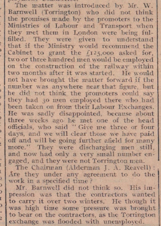 A resolution viewing with regret the little progress being made with the construction of the Torrington-Halwill Railway, and consequently the small number of men employed, and requesting the Ministry of Labour to use their influence with the contractors to expedite matters and employ more labour was passed at Thursday’s meeting of Barnstaple and District Employment Committee. The Secretary, Mr J T Richards, said the official return taken from the pay sheets showed that the number employed on the construction of the railway was 119 on September 22. He suggested that many of the stories they heard should be taken with a grain of salt.