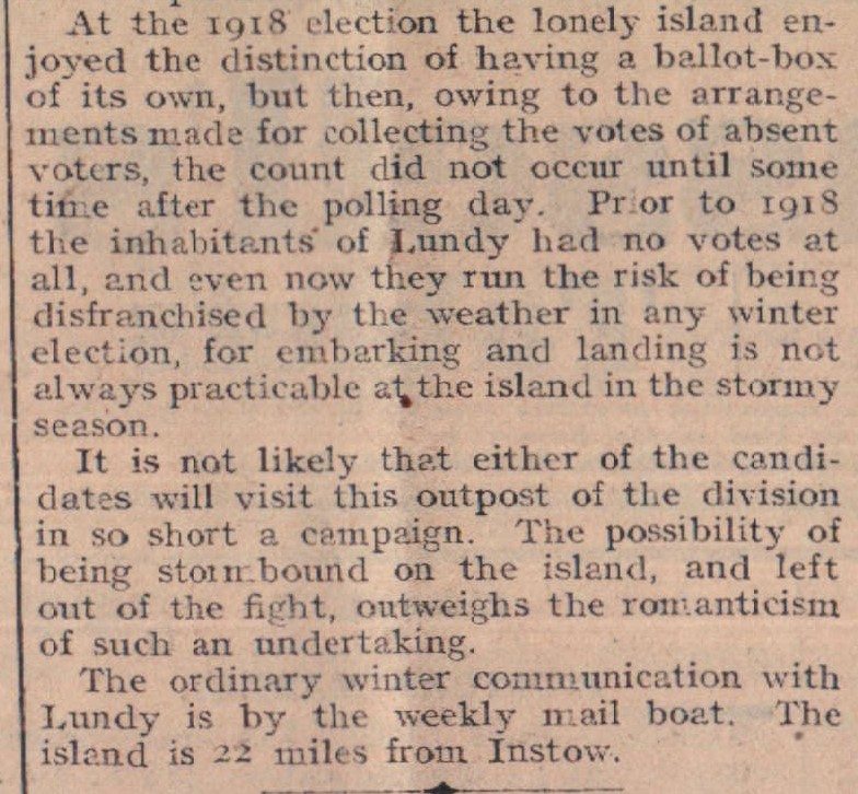 The voters on Lundy Island – on the present register there are 13 – will have to cross to Instow to record their vote in the Barnstaple Division.
