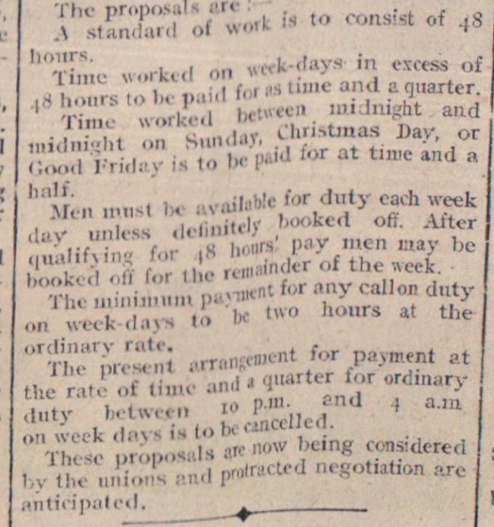 No extra pay for night work. The railway companies’ proposals for modifying the present national agreement as to hours, wages and conditions for railway workers have just been published. According to Mr C T Cramp, the men’s leader, they will mean an average reduction in wages of about 10s a week. The proposals are: