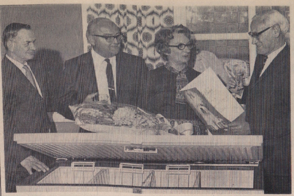 To mark her retirement after 24 years at the Torridge Hospital – 17 years as assistant matron and for the past seven years as matron – Mrs Mary D Ray was presented with a deep freeze cabinet by the hospital staff and friends in the medical and administrative branches of the health service locally. The gift was formally handed over to her by Dr William Ruddock, medical officer. In the photograph, are Mr and Mrs Ray, Mr J Morris and Dr Ruddock.