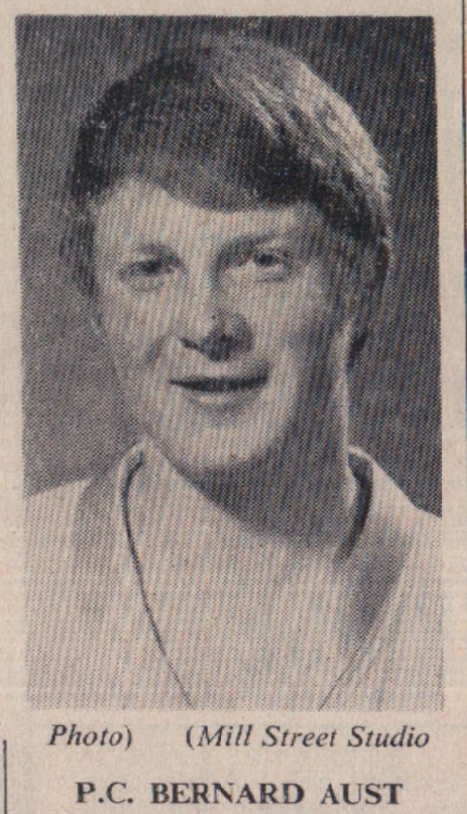 A telegram from Australia helped to relieve the anxiety of Clovelly parents whose elder son, a probationary policeman, injured while successfully dealing with an armed intruder in the grounds of the Lebanese Consulate at Sydney. The message told Mr and Mrs A F Aust, of Higher Clovelly sub post office, that their son, Bernard, has been discharged from hospital. The Australian Prime Minister, Mr William McMahon and the Lebanese Consul have visited PC Aust and congratulated him on his bravery. Bernard, who was 23 last April, served an apprenticeship as a compositor with Polypress of Bideford. He went to Australia and after working at his trade and other jobs, he joined the New South Wales Police Force. His brother, Brian, is a constable with the Metropolitan Police.