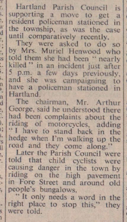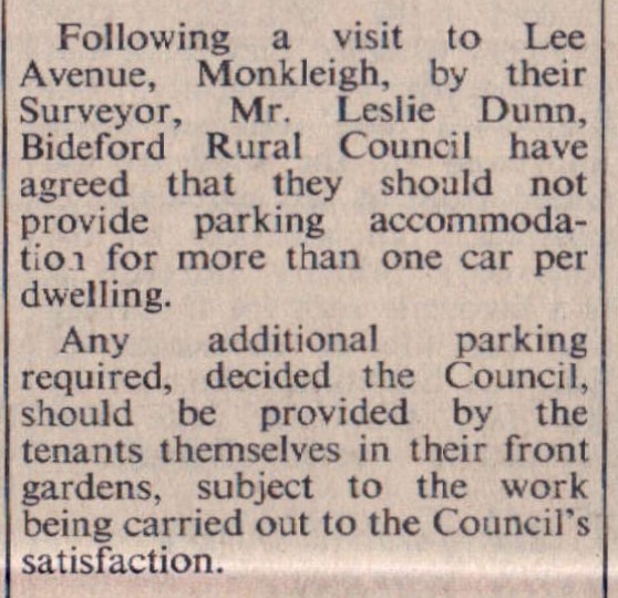 In a weather-related story, Mr F Wilkey spoke at a meeting of Northam Urban District Council to request that a shelter be built at Westward Ho! On the August Bank Holiday there were between three and four thousand people in the village, and all were left with no shelter when a storm hit. Mr J B Penhorwood added a plea for a shelter to be erected on Bone Hill in Northam. Mr S Fulford replied that as so much money was being spent on coastal erosion, the council could not commit any more at the moment.