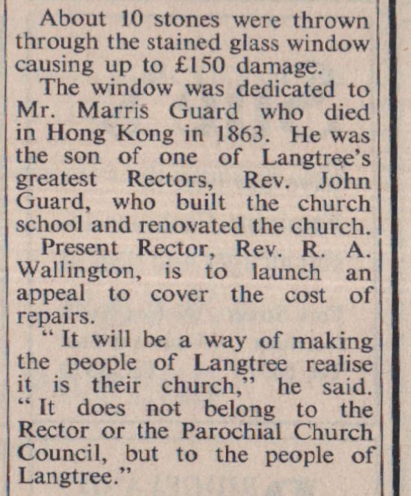 The 100-year-old east window (dedicated to Mr Marris Guard) of Langtree Parish Church has been wrecked by vandals.