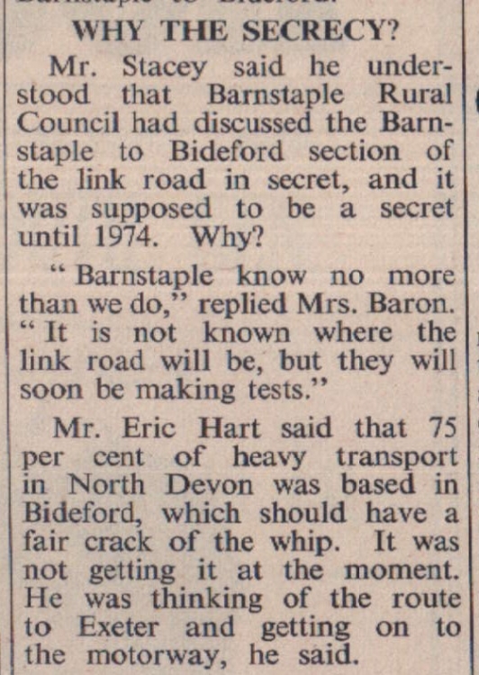 Motorway link route may soon be known. The Minister will indicate this month the probably three mile wide corridor within which experts will determine the precise route of the road that will link North Devon with the motorway. This news from Jeremy Thorpe, MP, was given to members of the Bideford Chamber of Commerce. The president, Mrs Joy Baron, told Mr K Stacey that something should also be heard soon about the route from Barnstaple to Bideford.