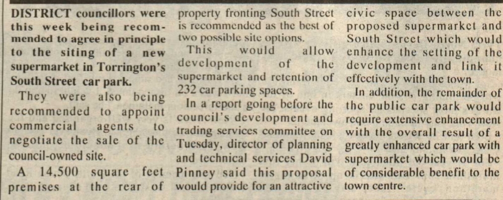 Torrington Town Council have turned down an application for permission to park a mobile tea and hot dog stall in the South Street car park on Friday and Saturday evenings. Mrs Y M Matthews, who made the application, has been told that the Council’s car park by-laws specifically exclude this type of facility.