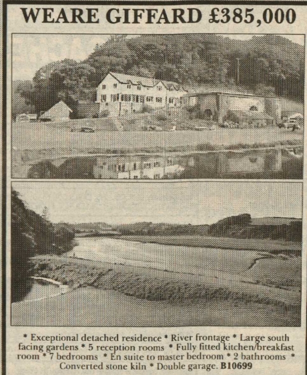 Weare Giffard £385,000 – exceptional detached residence* river frontage* large south facing gardens* 5 reception rooms* fully fitted kitchen/breakfast room* 7 bedrooms* en suite to master bedroom* 2 bathrooms* converted stone kiln* double garage.