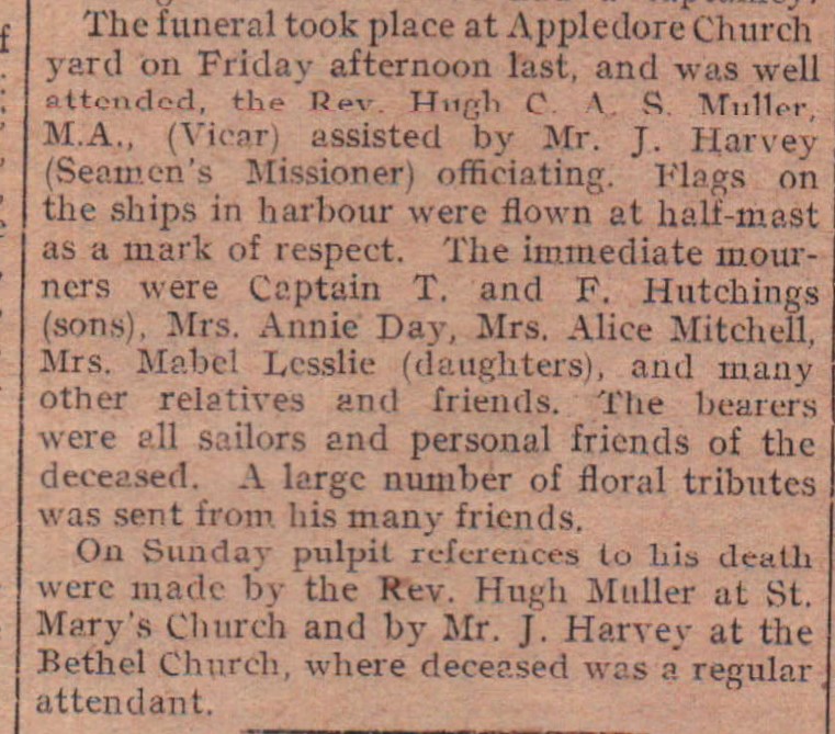 Appledore has lost one of its oldest inhabitants and seafarers in the person of Mr James Hutchings, whose death occurred at Homeside Terrace, Appledore. Deceased was a very familiar figure in the port and well known to the sailors. Born and bred in Appledore his career has been that of a true ‘son of the sea’. He had travelled far when still a young man, in the days of the old ‘clippers’ and had a most interesting career. He was one of the last of the Blockade Runners of the American War, and saw much service on the old wine ships which traded in the Mediterranean. He preferred to remain in the post he held although he could have had a captaincy.