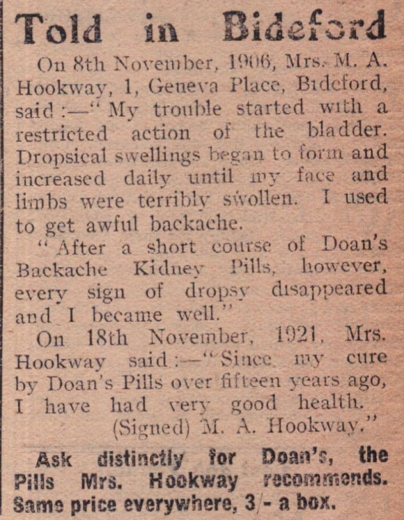 Mrs M A Hookway, 1 Geneva Place, Bideford, promotes the use of Doan’s Backache Kidney Pills.
