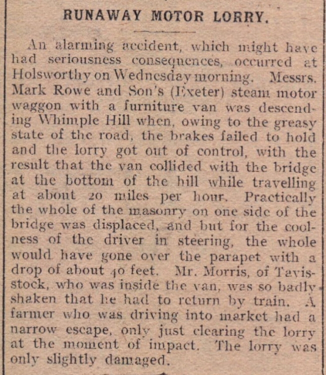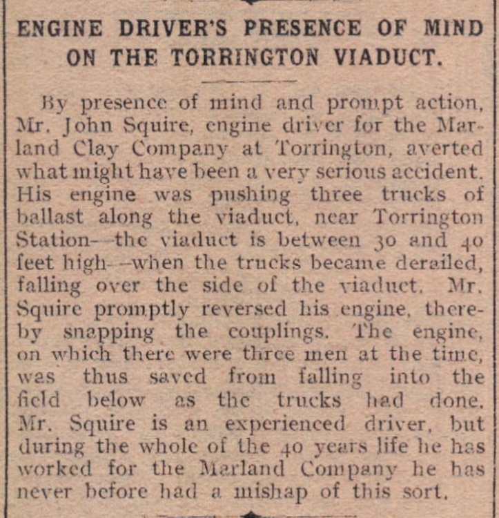 In other transport related news, Robert Edward Jollow was fined for negligently driving a horse and cart without having control of the reins in High Street and Mill Street in Bideford. In his defence Jollow said he only put down the reins to light his cigarette. Two accidents have been reported - one involving Mr John Squire, engine driver for Marland Clay Company at Torrington, and the other occuring at Holsworthy.