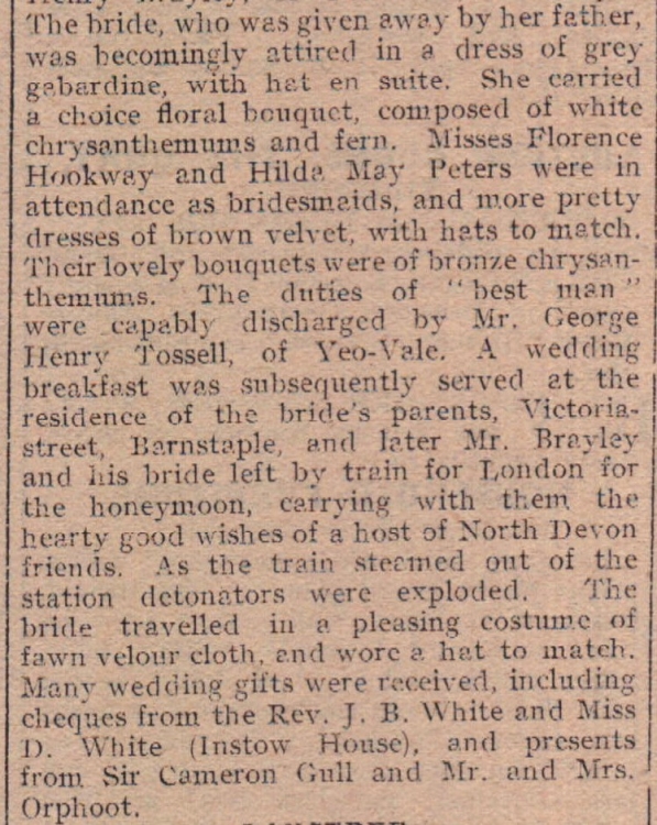 The Parish Church of Instow was the scene of a pretty wedding when the Rev J B White officiated at the marriage of Miss Charity Louise Hurley, daughter of Mr and Mrs Edward Hurley, of 9 Victoria Street, Barnstaple, and Mr Charles Henry Brayley of Yeo Vale. Attendants were Misses Florence Hookway and Hilda May Peters with Mr George Henry Tossell as ‘best man’.