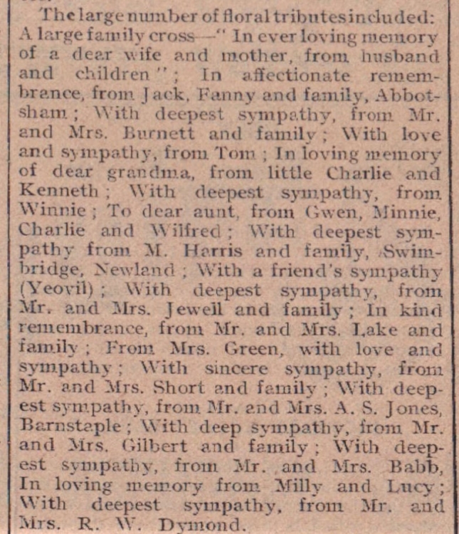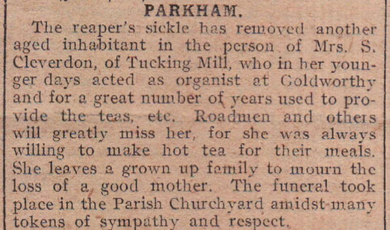 In Parkham, Mrs S Cleverdon of Tucking Mill leaves a grown up family to mourn the loss of a good mother.