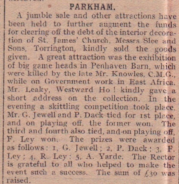 Hartland news - the children of Elmscott Council School have collected for Dr Barnardo’s Homes: B Jeffery, E Prouse, J Cloke, Ed Metherell, and A Metherell. Providence Missionary sermons were preached by Rev J T Perry. Mr E Hill was chairman at the evening meeting when the deputation gave a thrilling account of his life in France as Chaplain to the Forces. Rev Orchard gave an encouraging report of the work in China and Africa. The total proceeds including collections by Mr Bromell, Grace Cleave, Willie Slee and Willie Goaman were £10 17s 4d.
