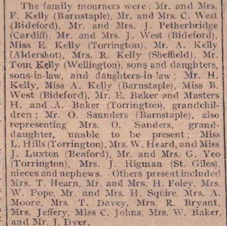 There were many expressions of sympathy at the double funeral in Torrington of Mr and Mrs Thomas Kelly, who had passed away within 48 hours of each other, aged 89 and 85, in Bideford. Mr Kelly and his wife (then Miss Grace Trigger) were married in 1857 at Roborough parish church by the Rev W Gurney. They reared a large family and eleven children survive them, two being in the United States. For several years Mr and Mrs Kelly resided at Torrington and later removed to Bideford living with their daughter, Mrs C West at 7 Lime Grove, where they died. The bearers were Messrs J Lake, H Folley, F Baker, H Squire, G Walters, and W J Brimacombe.