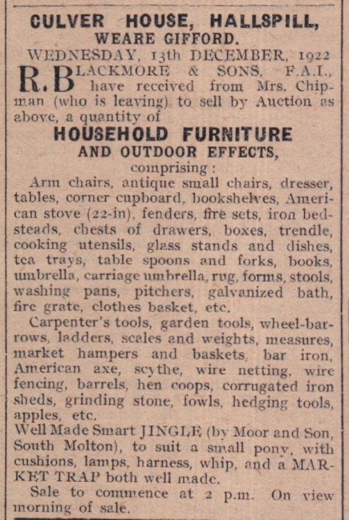 Household furniture and outdoor effects are for sale from Culver House, Hallspill, Weare Gifford. Mrs Chipman is leaving.