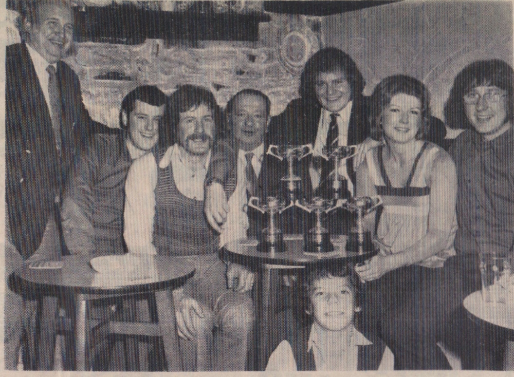 Bideford AAC junior fours crew, West of England champions, have been presented with personal cups given by Mr and Mrs Charlie Tallin of the Portobello Inn, in recognition of their achievements in the past season. At an enjoyable evening as guests of Mr and Mrs Tallin, they were presented with the cups by Miss S Sparey. In the photo are Messrs J Uren, R Ford, E Shortridge, C Talllin, D Butler, Miss S Sparey, Mr E Scott, and N Paddon.