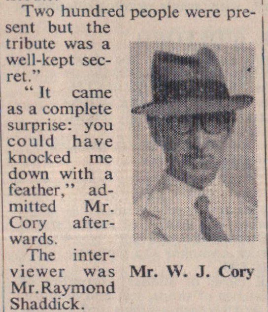 One of West Devon’s best known agricultural personalities, auctioneer Mr William John Cory – 89 – and still working as usual was honoured at Bradworthy, where he lives at Sunway, with a ‘this is your life’ tribute. Mr Cory’s work for local organisations was evidenced by Mr George Jacob, for Woolsery Show; Mr Bob Kivell for Holsworthy Show; Mr Alfred Saunders for the Methodist Church; Mr R G Pomeroy for Bradworthy Memorial Hall; Mr C T Collacott for Bradworthy British Legion; and Messrs W L Wickett and F W Slee, former employees. A telegram was read from Lord and Lady Caradon, and a letter was sent by a former Methodist minister, the Rev Ron Dale. Relatives on the platform included Mr Cory’s sisters, his brother, his sister-in-law, and his nieces. The programme also included music and song by the Melodymakers. Mr Shaddick acted as compere.