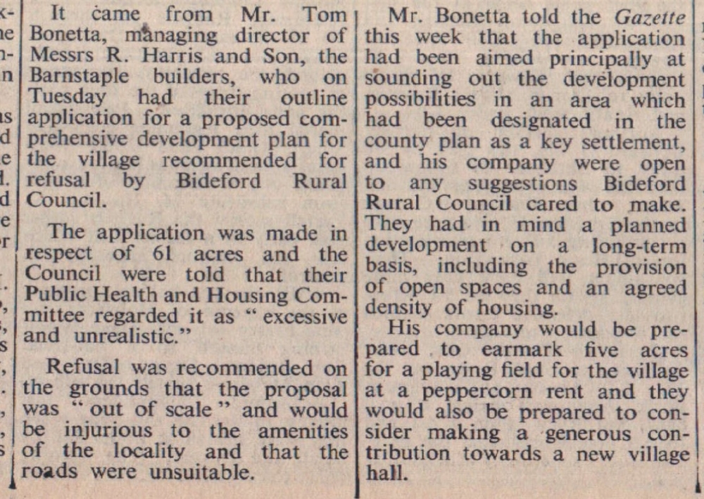 Major development at Buckland Brewer? The provision of a new village hall and playing field could be tied up with future development at Buckland Brewer, it was hinted by Mr Tom Bonetta.