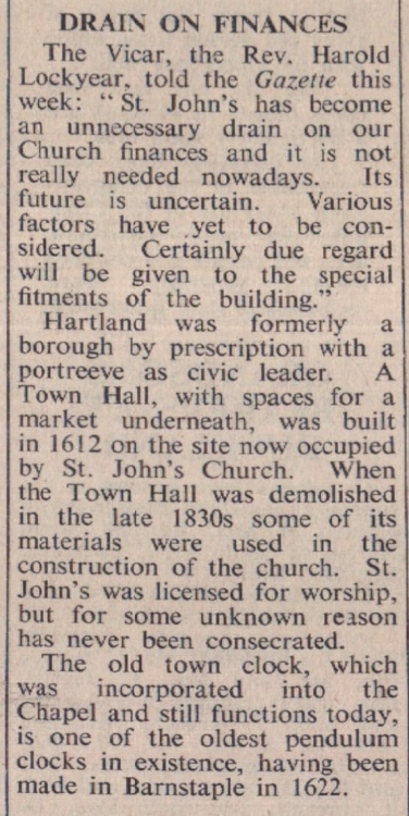 From the New Year St. John’s Church, the chapel-of-ease bordering Hartland Square, will cease to be used for worship. This decision has been made by the Parochial Church Council in view of the cost of maintaining the building and the fact that the large parish church of St Nectan, two miles from the township, now has a heating system and a special local bus service operates on Sundays for worshippers.