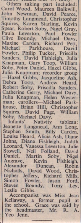 A capacity audience in Langtree Church Hall enjoyed the traditional carol services and tableaux presented by the children of the County Primary School. Climax was the infants’ Nativity tableaux presented by Mrs D Metherell, a member of the teaching staff. An address of welcome was given by the school captain, Catherine Gerry, and there were piano solos by John Bewes, Andrew Heard and W Soby.