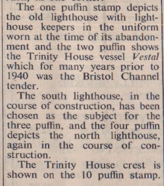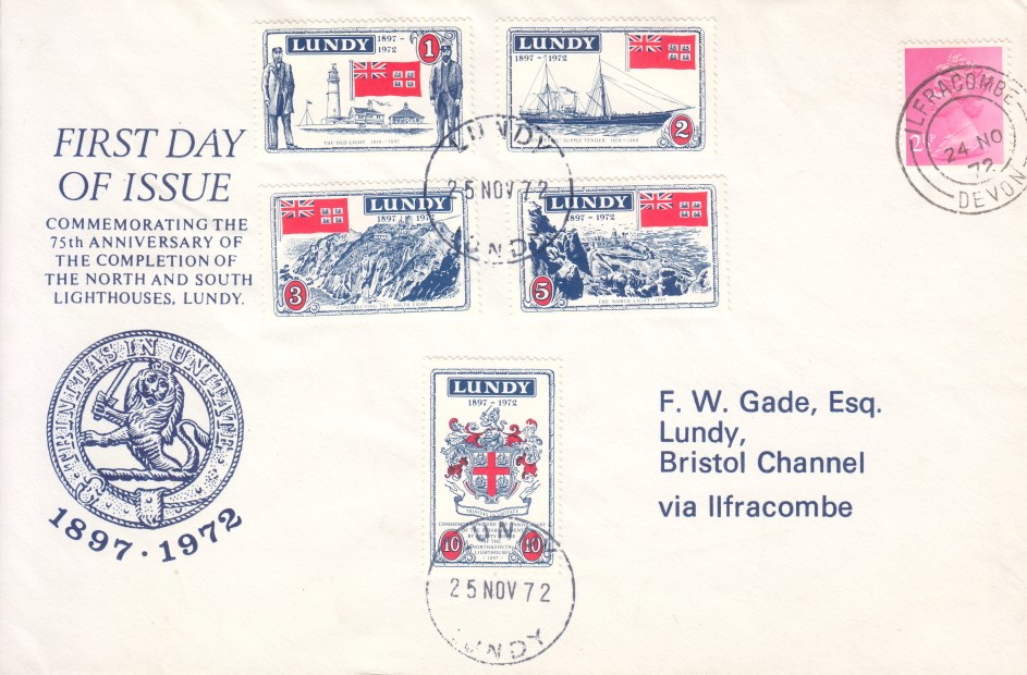 A new set of Lundy stamps is being issued to commemorate the 75th anniversary of the completion of the Lundy North and South lighthouses in 1897. It is the second new issue this year. The new issue, designed by Mr John Dyke, will have the Trinity House ensign in one corner.