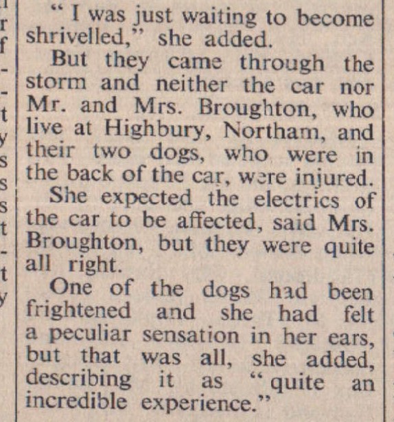 A Northam couple, Mr and Mrs Rex Broughton, had a lucky escape when their car was struck by lightning at the height of a thunderstorm. They were travelling along the main road from Yelland to Instow “when suddenly the whole car appeared incandescent.”