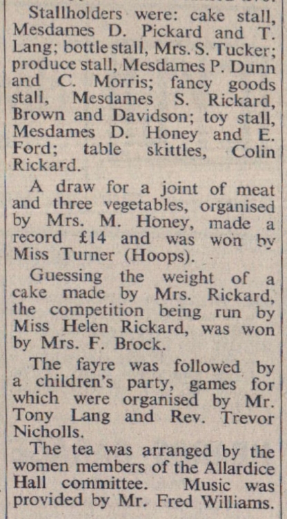The organ repair fund at Alwington Church benefited by £100 as a result of a Christmas Fair held at the Village Hall. The Rector, Rev T Nicholls, officially opened the sale. Stallholders included: Mesdames C Metherell, A Glover, Mrs Elston, Misses A Lott, M Daniel, Mesdames N Westaway, W Turner, T Nicholls, R Smythe, Biggs, V Westlake, B Parr, G Lewis, G Boundy, H Hillman, O Lewis, H Williams, W Allin. Posters were designed by Miss A Wills (Bideford). Draw winners were Col J Pine Coffin, Mrs Biggs and Mrs Peskitt.
