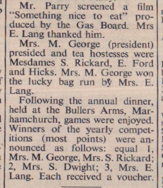 Entries in a mince pie competition at the December meeting of Parkham WI were afterwards distributed among village old-age pensioners who live alone. Competition winners were Mrs E Lang, Mrs Smart, Mrs E Ford, Mrs E Hicks, Mrs B Heywood. Judges were Mrs Rickard and Mr and Mrs N Parry.