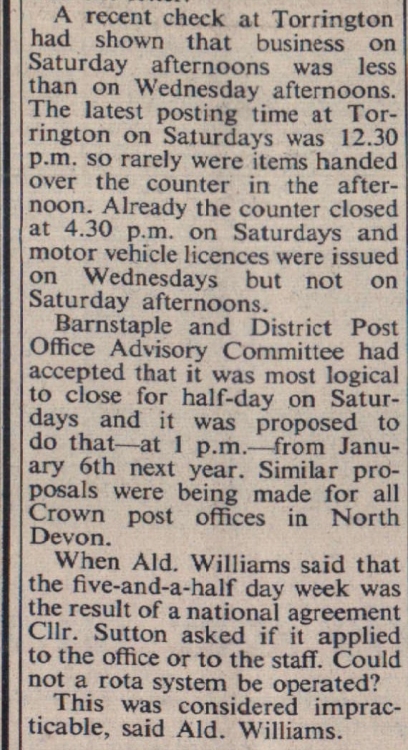 Cllr C R Sutton told Torrington Town Council that he had had many bitter comments about service at the town post office and Ald G Williams said that someone had had to wait at the counter for half-an-hour. The Council were considering a letter from the acting head postmaster about half-day closing. Generally throughout the country Saturday had been chosen as the most suitable day.