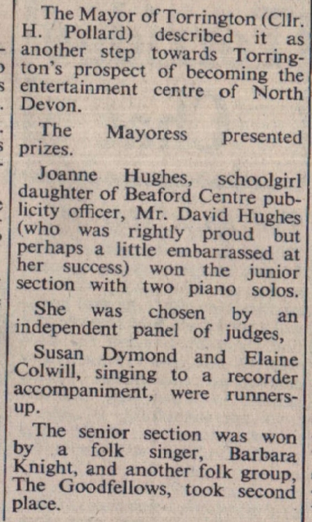 ‘Fish out of water’ the latest production of Bideford Community College drama group, proved their best yet. The three-act comedy by Derek Benfield was ideally suited to this small company. Portraying the adventures of a very mixed group of English tourists on the Italian Riviera, it ends, of course, with romance – one expected and one quite the opposite. As the dominating Agatha Hepworth, Betty Maynard captured much of the attention, and Edie Hill’s sympathetic portrayal of the pitiable Fiona Francis also won praise. The mere appearance of Cyril Squires as the pathetic Mr Mallett brought laughter from the audience. Geoff Skinner and Audrey Jones as Brigadier and Mrs Hubback tried to remain aloof from the fellow guests; Dora Cowley the friendly ‘clippy’ with a yearning for romance was a lively study by Christine Ellis; Jane Walters was the Italian waitress Marisa; Mike England the holiday tour representative, Julian Whittle; and Steve Ball the ‘would be wolf’ Len Barrett. The play was produced by Bob Terrell, Barbara Terrell was prompt and Fred Jones, stage manager.