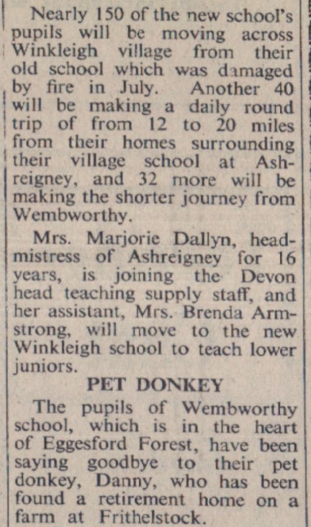 Moving into the new primary school at Winkleigh next term, in addition to local children, will be pupils of two other village schools, those of Ashreigney and Wembworthy which close this week. Mrs Marjorie Dallyn is joining the Devon head teaching supply staff, and her assistant, Mrs Brenda Armstrong, will move to the new Winkleigh school. Mrs Margaret Prini is moving to Westward Ho! and to a part time teaching post at Appledore. Her assistant Mis Muriel Greenslade will be at Winkleigh.