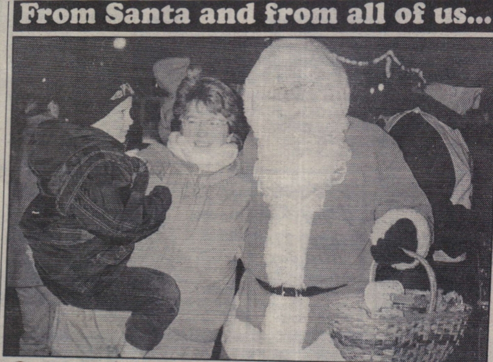 Compliments of the season. Santa stopped off in Bideford to tour the town and meet youngsters. Aided by Appledore lifeboat and Bideford Lions’ Club the grand old man came up the river by boat. Then it was off around the town, led by a Samba Band and Morris Dancers. He is pictured with young Robert Mould and his mum Julie.