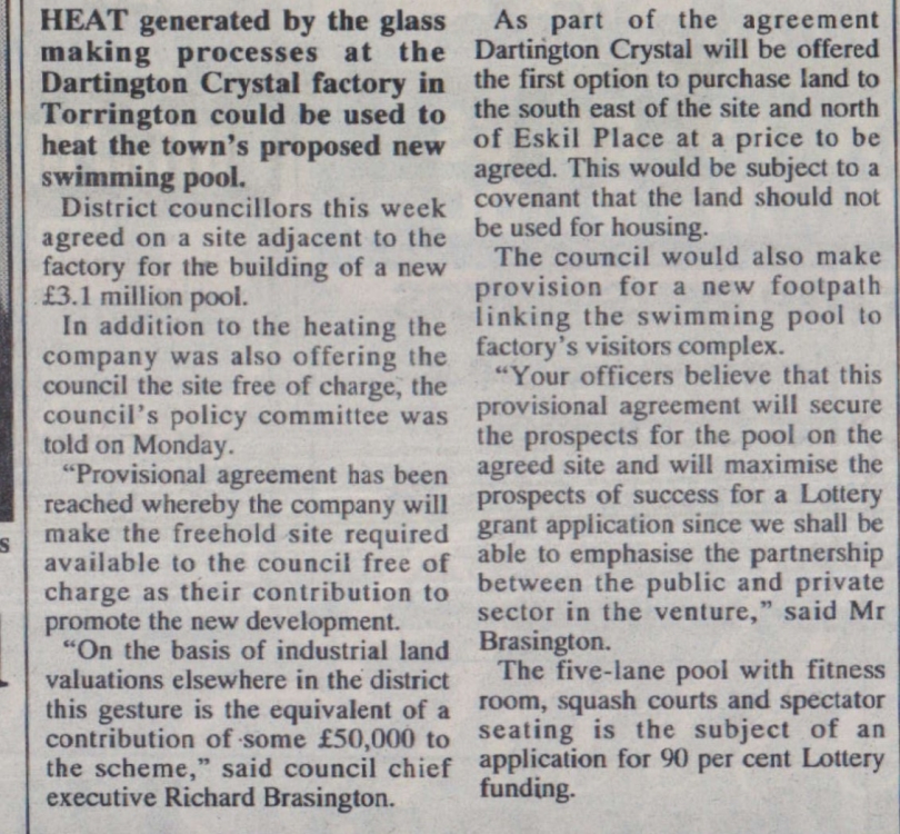 New pool site has heating thrown in as heat generated at the Dartington Crystal factory could be used to heat the town’s proposed new swimming pool.