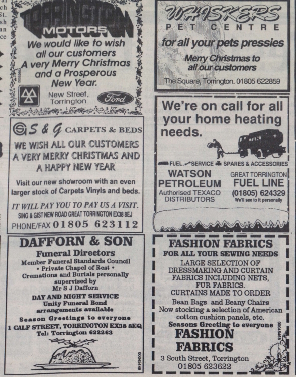 British Rail’s delay in delivering 250 yards of special insulated steel wire from suppliers in Bristol has held up Torrington’s Christmas decorations plan. The cable was despatched from Bristol by recorded passage train delivery but it has still not arrived. Mr Peter Symons, Torrington Borough Surveyor, said that it had been hoped to have the lights installed by this weekend but it now looked as though they would be delayed for another week. The Christmas lights would be better and bigger this year than ever before as the Town Council had bought £180 worth of lights from Exeter and the total cost of the scheme was likely to be £250, not counting labour.