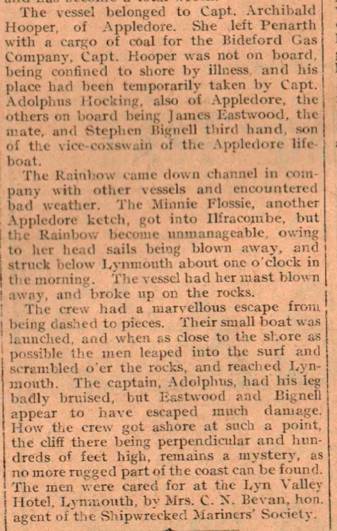 The 95-ketch Rainbow, of Appledore, belonging to Capt Archibald Hooper has become a total wreck.