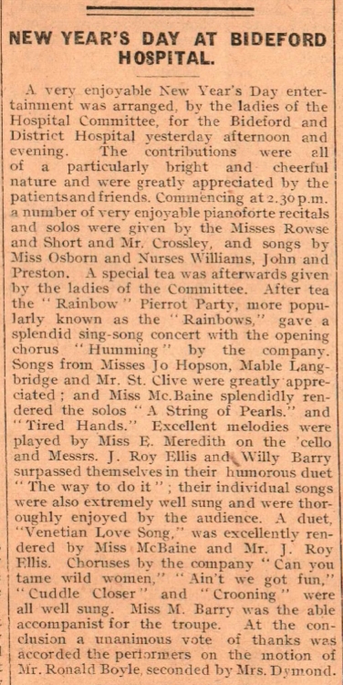 The ’Rainbows’ a Pierrot Concert Party from Bideford, under the direction of Mr Willie J Barry, recently gave a high class entertainment in the Rifle Hall, Instow, in aid of the funds of the Instow AFC. Those taking part were Mr W Barry, and the Misses Ethel McBaine, Mabel Langbridge, and Jo Hopson. The acting was of a very high order, especially that of Miss Hopson in the part of the female servant Mary.