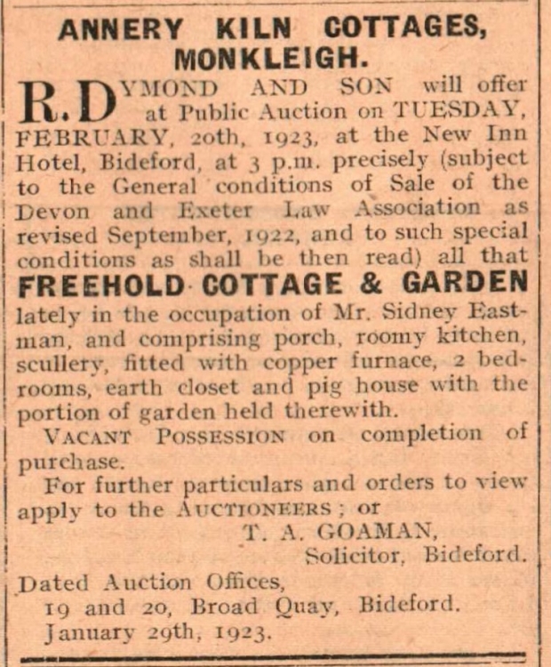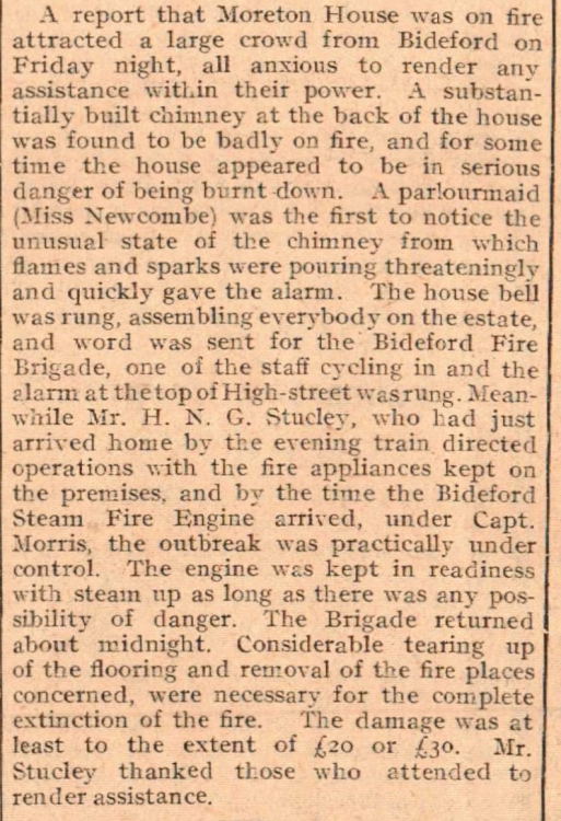 A disastrous fire, resulting in the destruction of a block of three small thatched roofed cottages and damage to an adjoining house, occurred at Westleigh. The adjoining house, a comparatively new building, slate roofed, double fronted, occupied by the owners Nr and Mrs Braunton and their family, was undoubtedly saved by the efforts of the Bideford Fire Brigade and other helpers. The three cottages were reduced to a heap of ruins. During the height of the fire, it being almost on a hill top, the smoke was plainly seen from Bideford, and as far away at Torrington Common and Saunton. The families rendered homeless were Mr and Mrs G H Saunders with the children (who were in the first house to catch fire), and Mr and Mrs T Tucker, and their four children. The Sanderses have gone temporarily to friends at Lovacott, and the Tuckers with the Huxtables at Souchcott. The three cottages destroyed were the property of Mr A L Christie, JP, DL, of Tapeley Park, and were insured.