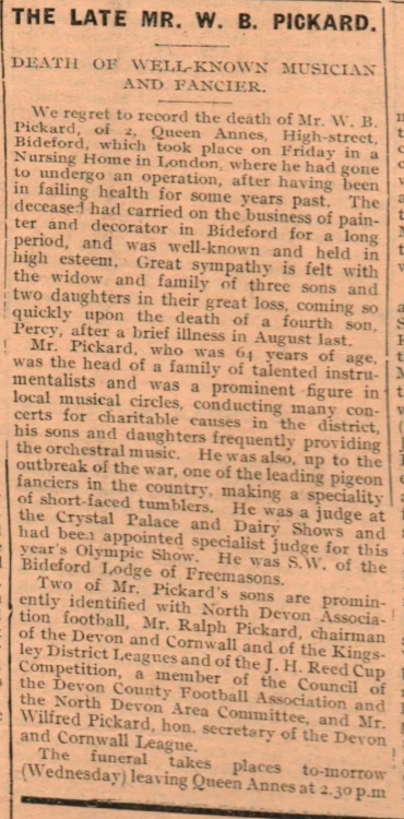 Mr W B Pickard of 2 Queen Annes, High Street, Bideford, has died.