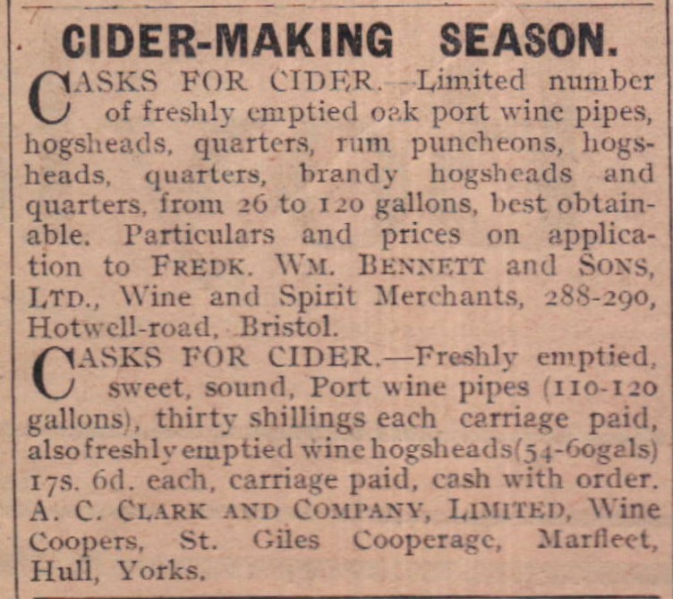 Advances are being granted on houses, shops, farms, fields etc on very favourable terms, with easy monthly repayments of principal and interest. Contact the North Devon P & T Benefit Building Society, Bridge Buildings, Bideford. There are at present too many copper coins in circulation - those showing the head of Queen Victoria uncrowned are the most worn and regarded as the most suitable to be withdrawn. In other news, it is cider making season and casks are for sale.