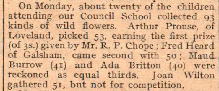 Edistone Prize giving entertainment took place on Friday at Hartland. Pastor Hill took the chair with Miss J Bragg at the organ. Those taking part in the programme included: Stanley Heard, Ida Cloke, Evelyn Bragg, Ivy Cornish, Fred Westlake, Wesley Heard, Myrtle Hill, Elizabeth Heard, Mary Bragg, Jack Walter, Stanley Heard, May Bragg, and the scholars. Mr Hill presented the prizes. Tree, tea, games and supper were given by the scholars and refreshments were also provided for visitors.