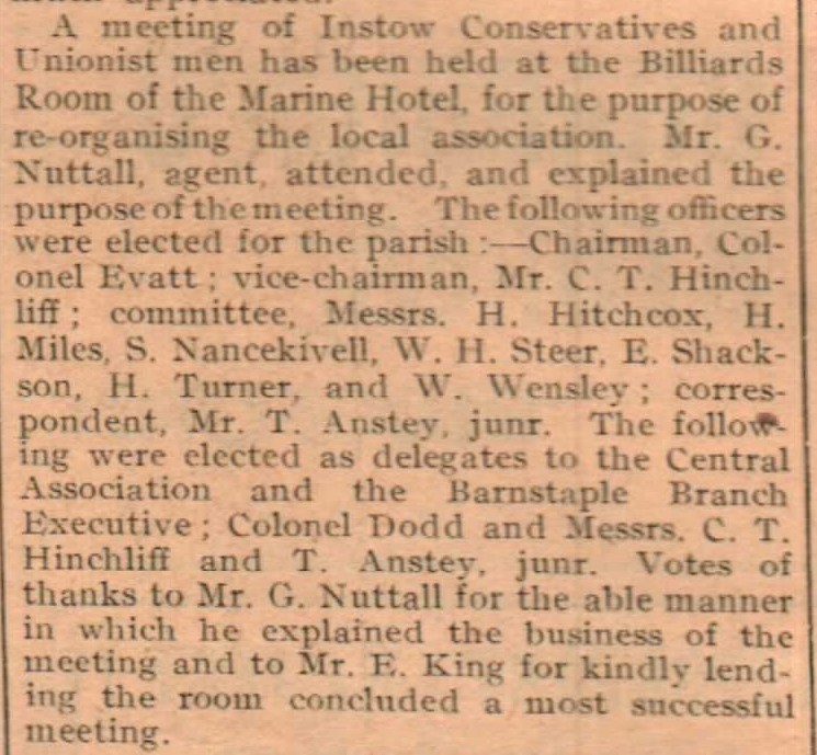 Instow Conservatives and Unionist men meet in the Billiards Room of the Marine Hotel.